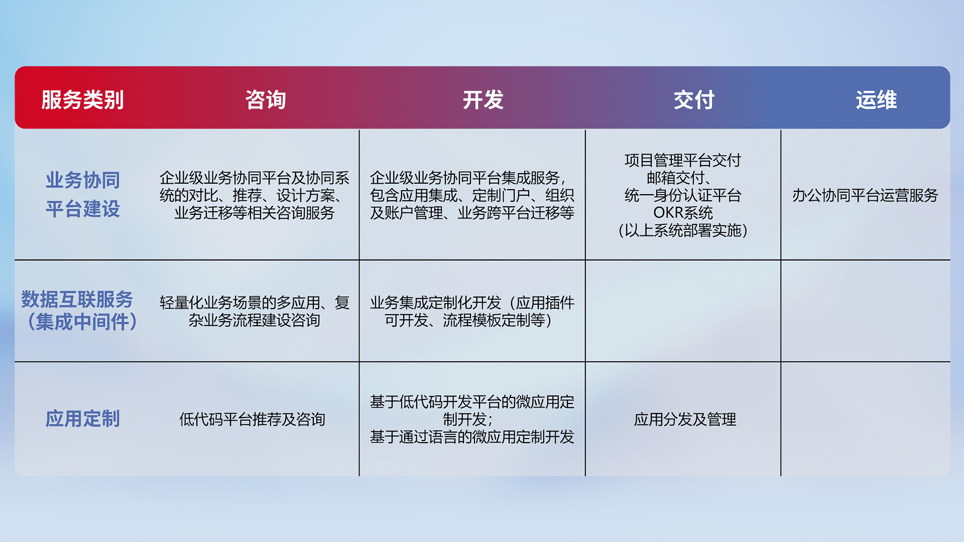 针对钉钉、、企微、、、、IDaas等平台级产品提供产品的规划、、、方案、、、交付、、、、定制化开发等服务,,实现如统一协同办公、、智能客户服务、、、、混合会议管理、、、、智能数据查询、、、、等业务场景,,,,实现数字化转型。。。。